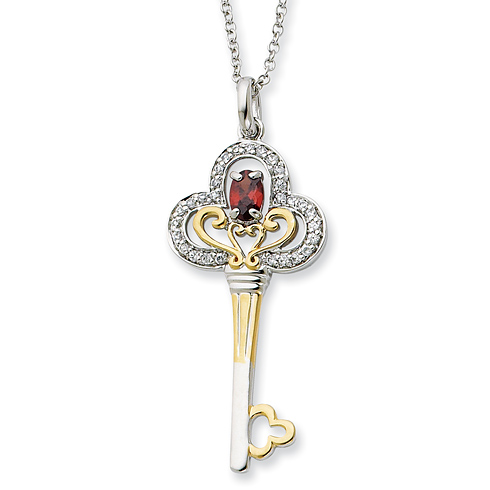 January birthstone cubic zirconia key pendant is made of polished sterling silver. 18in sterling silver chain has a spring ring clasp. Weight: 4.19 grams.Each piece of Sentimental Expressions Jewelry comes pre-packaged in a stylish magnetic gift box, to protect the jewelry that has so much to say. Also included is a poem card with the poem & verse printed in English on one side and Spanish on the other.History: Birthstone Key Here is a special birthstone key to unlock a year of favor, happiness and success in all that you do. It is a symbol to wear to remind you that open doors of opportunity are coming your way. You can expect goodness and mercy to follow you. Celebrate another year to share laughter and friendship with those you love. With this key unlock your best year ever!Verse: Message: