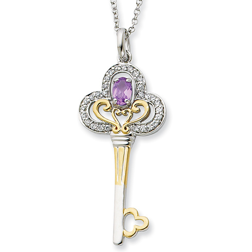 Gold-plated sterling silver key necklace is set with a small purple oval cubic zirconia. Pendant size: 1in x 11/16in. Sterling silver 18in chain has a spring ring clasp. Weight: 4.19 grams.Each piece of Sentimental Expressions Jewelry comes pre-packaged in a stylish magnetic gift box, to protect the jewelry that has so much to say. Also included is a poem card with the poem & verse printed in English on one side and Spanish on the other.History: Birthstone Key Here is a special birthstone key to unlock a year of favor, happiness and success in all that you do. It is a symbol to wear to remind you that open doors of opportunity are coming your way. You can expect goodness and mercy to follow you. Celebrate another year to share laughter and friendship with those you love. With this key unlock your best year ever!Verse: Message: