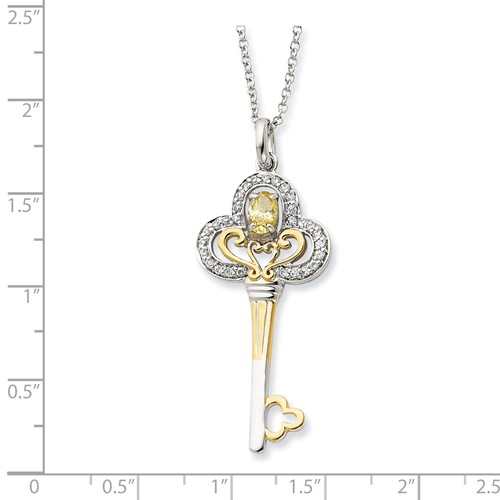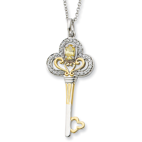 Gold-plated sterling silver key necklace is set with an orange oval cubic zirconia. Pendant size: 1in x 11/16in. Sterling silver 18in chain has a spring ring clasp. Weight: 4.19 grams.Each piece of Sentimental Expressions Jewelry comes pre-packaged in a stylish magnetic gift box, to protect the jewelry that has so much to say. Also included is a poem card with the poem & verse printed in English on one side and Spanish on the other.History: Birthstone Key Here is a special birthstone key to unlock a year of favor, happiness and success in all that you do. It is a symbol to wear to remind you that open doors of opportunity are coming your way. You can expect goodness and mercy to follow you. Celebrate another year to share laughter and friendship with those you love. With this key unlock your best year ever!Verse: Message: