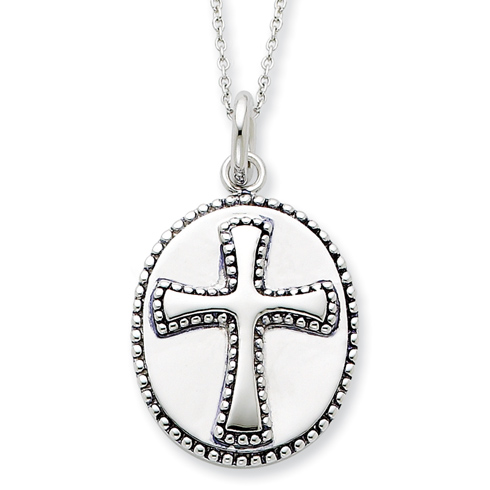 Beaded oval cross necklace is made of polished sterling silver. Black rubber cord is 18 inches in length. Weight: 8.81 grams.Each piece of Sentimental Expressions Jewelry comes pre-packaged in a stylish magnetic gift box, to protect the jewelry that has so much to say. Also included is a poem card with the poem & verse printed in English on one side and Spanish on the other.History: Verse: Boldness For God did not give us a spirit of timidity but a spirit of power of love and self discipline 2nd Timothy 1:7 The mind controlled by the spirit is life and peace. Romans 8:6Message: