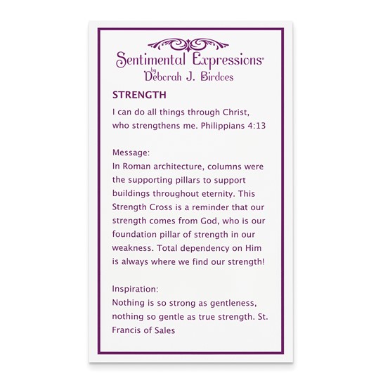 This large sterling silver cross pendant dangles from a sterling silver 18in chain. Dimensions: 2in x 1 1/8in. Weight: 9.38 grams.Each piece of Sentimental Expressions Jewelry comes pre-packaged in a stylish magnetic gift box, to protect the jewelry that has so much to say. Also included is a poem card with the poem & verse printed in English on one side and Spanish on the other.History: Verse: Strength I can do all things through Christ, who strengthens me. Philippians 4:13 Inspiration: nothing is so strong as gentleness, nothing so gentle as true strength. St. Francis of SalesMessage: Message: In Roman architecture, columns were the supporting pillars to support buildings throughout eternity. This Strength Cross is a reminder that our strength comes from God, who is our foundation pillar of strength in our weakness. Total dependency on Him is always where we find our strength!