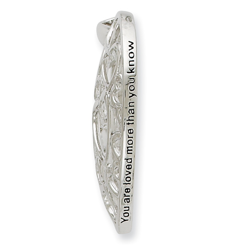 Polished sterling silver heart pendant with 18in chain. Pendandt dimensions: 1in x 1in. Side of the pendant inscription: You are loved more than you know. Weight: 5.55 grams.Each piece of Sentimental Expressions Jewelry comes pre-packaged in a stylish magnetic gift box, to protect the jewelry that has so much to say. Also included is a poem card with the poem & verse printed in English on one side and Spanish on the other.Verse: You are loved more than you know! If you could only see the inside walls of my heart. There would be multiple hearts within a big heart. It is how I feel about you. My heart is bursting. Know that you are loved more than you can imagine.