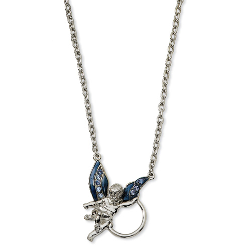 Silver-tone 28in angel eyeglass necklace has blue enamel and blue crystals. Fancy lobster clasp. Part of the 1928 jewelry collection.