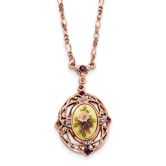 Polished mixed metal. 28in Necklace. Stone info: Floral decal, light and dark purple Crystal rose-tone. Fancy lobster clasp. Part of the 1928 jewelry collection.