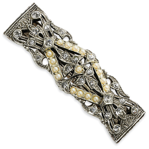 Polished mixed metal. Barrette. Stone info: Cultura glass pearl, crystal. Silver-tone. Part of the 1928 jewelry collection.