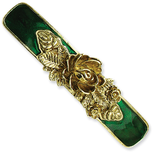 Polished mixed metal. Barrette. Stone info: Green enamel, brass-tone. Part of the 1928 jewelry collection.