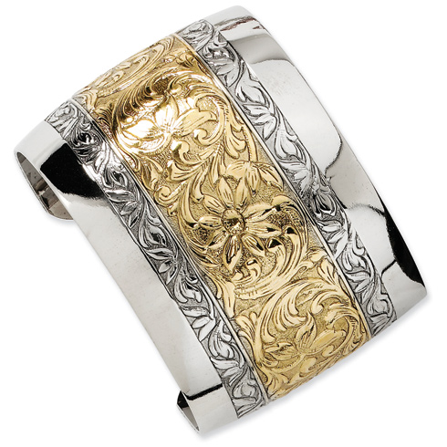 Polished mixed metal. Cuff bangle. Stone info: Gold-tone and silver-tone. Part of the 1928 jewelry collection.