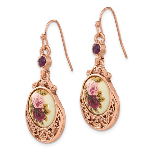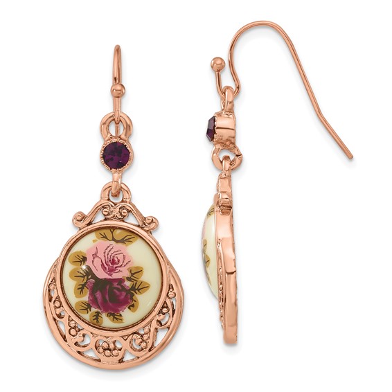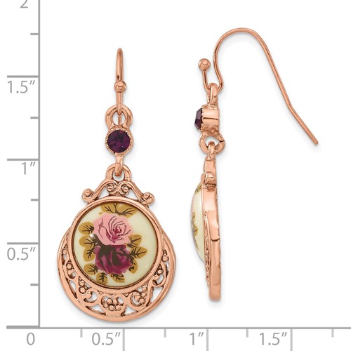 Rose tone floral decal drop earrings in polished mixed metal. Earrings. Stone info: Floral decal, purple Crystal rose-tone. Part of the 1928 jewelry collection.