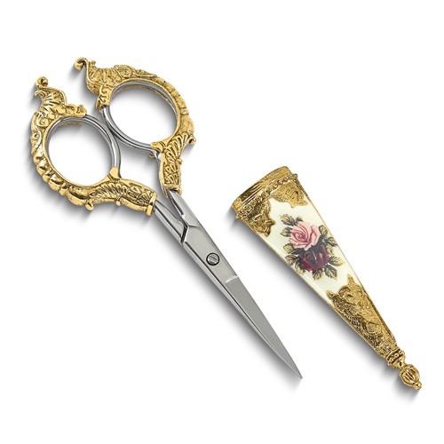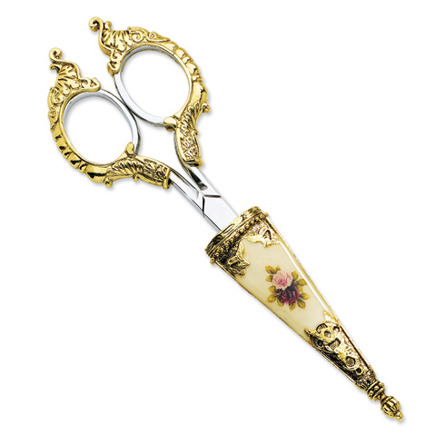 Polished mixed metal. Scissors. Stone info: Floral decal, 1 1/2in stainless steel blades, brass-tone. Part of the 1928 jewelry collection.