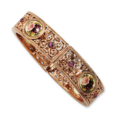 Polished mixed metal. Stretch bracelet. Stone info: Floral decal, purple Crystal rose-tone. Part of the 1928 jewelry collection.