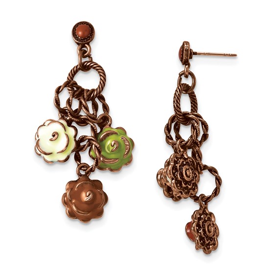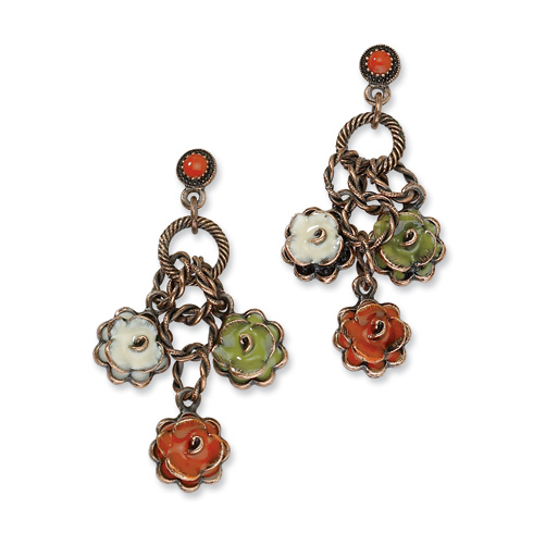 Polished mixed metal. Post earrings. Stone info: Green, orange and ivory enamel, copper-tone. Part of the 1928 jewelry collection.