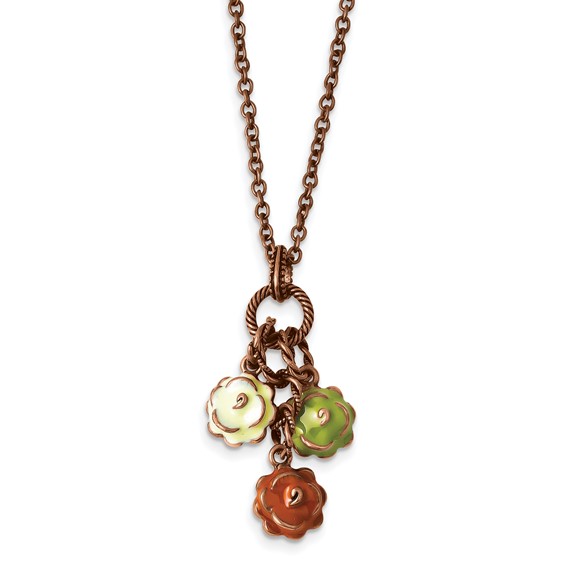 Flower enamel necklace in polished mixed metal. 16in Necklace with 3in extension. Stone info: Green, orange and ivory enamel, copper-tone. Fancy lobster clasp. Part of the 1928 jewelry collection.
