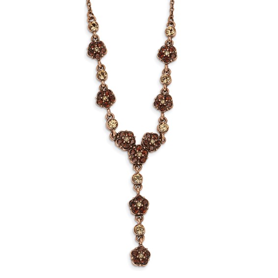 Polished mixed metal. 15in Necklace with 3in extension. Stone info: Light colorado and brown Crystal copper-tone. Fancy lobster clasp. Part of the 1928 jewelry collection.