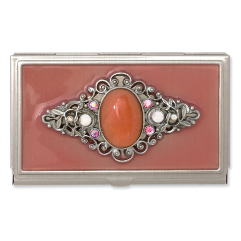 Business card case is decorated with pink enamel and strawberry quartz. European crystals, steel, pewter-tone, gift pouch. Dimensions: 4in x 2.5in. Part of the 1928 jewelry collection.