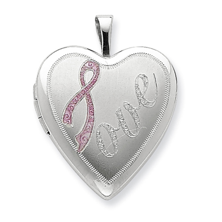 Satin sterling silver, heart shaped locket features pink enamel. 3/4in x 3/4in. This item is slightly larger than a penny. Made in Hong Kong. Not engravable. Chain sold separately.
