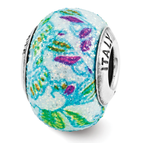 Multi-colored overlay glass bead is made of solid sterling silver with antique finish. This bead fits all major modular bracelet brands. Made in Italy.