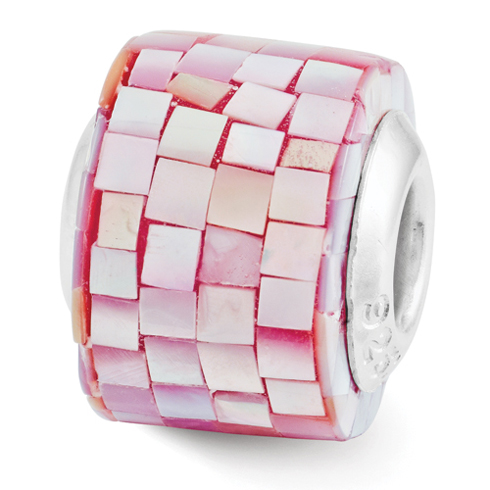 Red mother of pearl mosaic glass bead is made of solid sterling silver with antique finish. This bead fits all major modular bracelet brands. Imported.