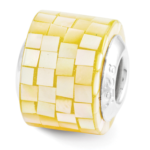Yellow mother of pearl mosaic glass bead is made of solid sterling silver with antique finish. This bead fits all major modular bracelet brands. Imported.