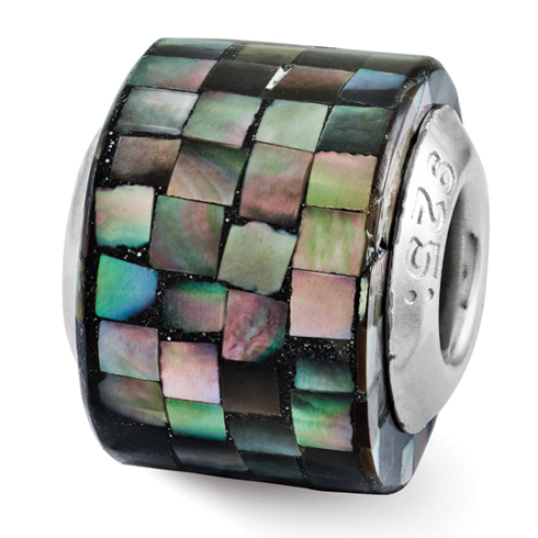 Black mother of pearl mosaic glass bead is made of solid sterling silver with antique finish. This bead fits all major modular bracelet brands. Imported.