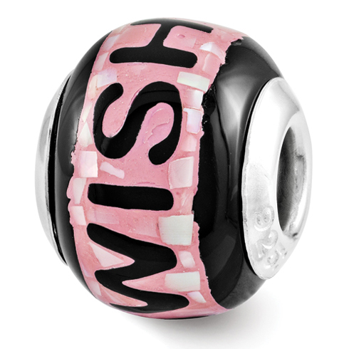 Pink and black mother of pearl WISH glass bead is made of solid sterling silver with antique finish. This bead fits all major modular bracelet brands. Imported.