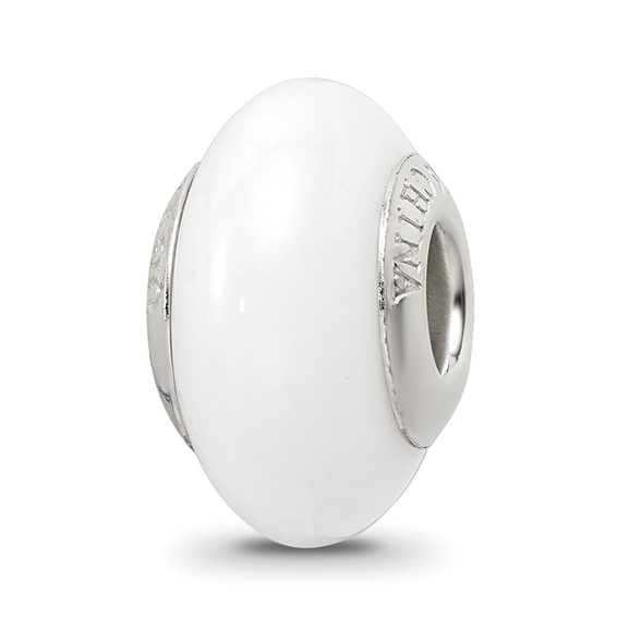 White glass bead is made of solid sterling silver with antique finish. Bead size: 14.5mm x 8.1mm. This bead fits all major modular bracelet brands. Imported.