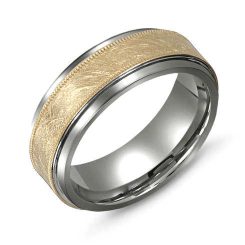 Titanium wedding band features a wire brushed 10kt yellow gold overlay with milgrain. Steop down, polished edges. Comfort fit. Width: 8mm. Each wedding band is made to order. Made in Canada. Lifetime GuaranteeEach ring is covered by a limited lifetime warranty against any manufacturer's defect concerning materials and workmanship. In addition, in the event that your ring gets damaged during normal wear, the manufacturer will repair or replace your ring free of charge.