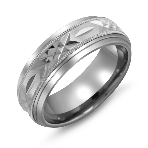 Titanium wedding band features a brushed and polished 10kt white gold overlay with milgrain. Step down, polished edges. Comfort fit. Width: 8mm. Each wedding band is made to order. The 10kt white gold is press fit upon the blank cut from a seamless titanium tube. Made in Canada.
