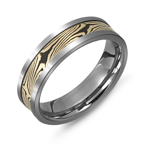 Titanium wedding band features a 10kt yellow gold overlay with Mokume style design. Flat polished edges. Comfort fit. Width: 6mm. Each wedding band is made to order. The 10kt yellow gold is press fit upon the blank cut from a seamless titanium tube. Made in Canada.