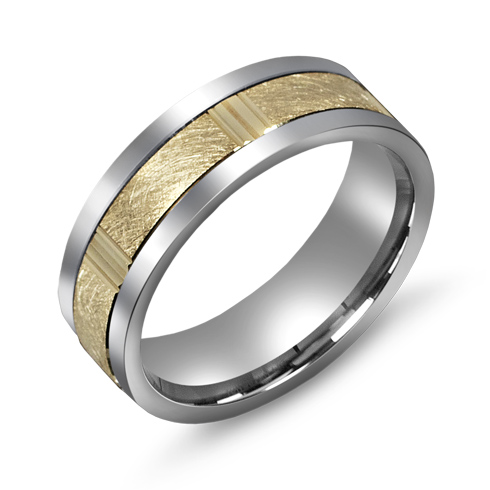 Titanium wedding band features a grooved 10kt yellow gold overlay with wire brush finish. Comfort fit. Width: 7mm. Each wedding band is made to order. The 10kt yellow gold is press fit upon the blank cut from a seamless titanium tube. Made in Canada.