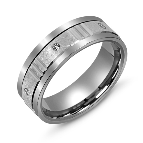 Titanium wedding band features a wire brush 10kt white gold overlay. The overlay has genuine diamond accents and grooves. Flat polished edges. Comfort fit. Width: 7mm. Each wedding band is made to order. The 10kt yellow gold is press fit upon the blank cut from a seamless titanium tube. Made in Canada.