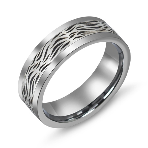 Titanium wedding band features a polished 10kt white gold overlay with stripes design. Flat polished edges. Comfort fit. Width: 7mm. Each wedding band is made to order. The 10kt white gold is press fit upon the blank cut from a seamless titanium tube. Made in Canada.