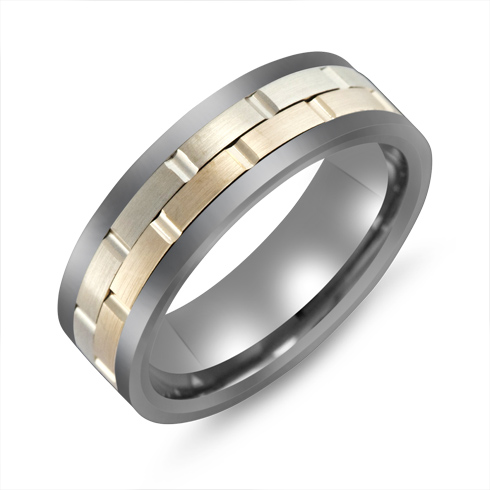 Titanium wedding band features a brushed 10kt white and yellow gold overlay with grooves. Flat polished edges. Comfort fit. Width: 7mm. Each wedding band is made to order. The 10kt two tone gold is press fit upon the blank cut from a seamless titanium tube. Made in Canada.