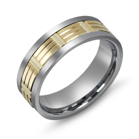 Titanium wedding band features a brushed 10kt yellow gold overlay with diamond cut grooves. Flat polished edges. Comfort fit. Width: 7mm. Each wedding band is made to order. The 10kt yellow gold is press fit upon the blank cut from a seamless titanium tube. Made in Canada.