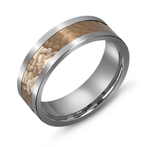 Titanium wedding band features a hammered 10kt rose gold overlay. Flat polished edges. Comfort fit. Width: 7mm. Each wedding band is made to order. The 10kt rose gold is press fit upon the blank cut from a seamless titanium tube. Made in Canada.