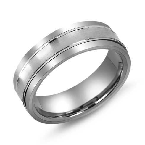 Titanium wedding band features a brushed 10kt white gold overlay and polished grooves. Flat polished titanium edges. Comfort fit. Width: 7mm. Each wedding band is made to order. The 10kt white gold is press fit upon the blank cut from a seamless titanium tube. Made in Canada.