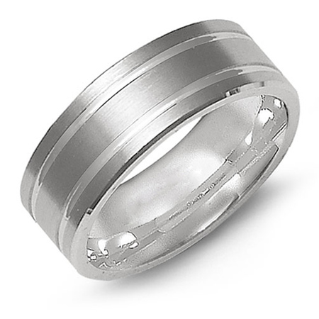 14kt white gold wedding band features two polished grooves and a flat satin center. Cast to size and comfort fit. Width: 8mm. Each wedding band is made to order. Made in Canada.