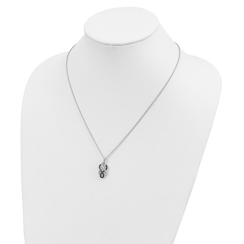 Black and white diamond fancy knot necklace is made of polished sterling silver with rhodium plating. Pendant size: 1in x 1/2in. Diamond ct weight: 0.53. Weight: 1.7 grams. Part of the White Night jewelry collection. Each item includes a free White Night gift box.
