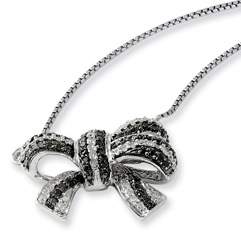Black and white diamond bow necklace is made of polished sterling silver with rhodium plating. Diamond ct weight: 0.341. Bow size: 3/4in x 1/2in. Weight: 2.5 grams. Part of the White Night jewelry collection. Each item includes a free White Night gift box.