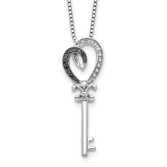 Black and white diamond key necklace is made of polished sterling silver with rhodium plating. Diamond carat total weight: 0.12. 18in sterling silver box chain has a lobster clasp. Weight: 1.59 grams. Part of the White Night jewelry collection. Each item includes a free White Night gift box.