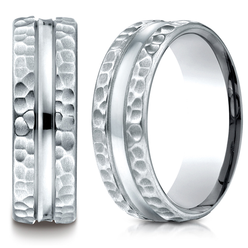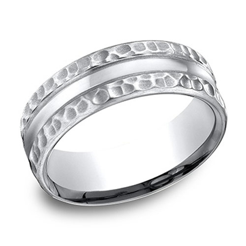 Platinum wedding band features hammered edges and high polish center cut. Die struck and comfort fit. Width: 7.5mm. Solid platinum 950 [95% Platinum, 5% Ruthenium alloy]. Made in the USA.