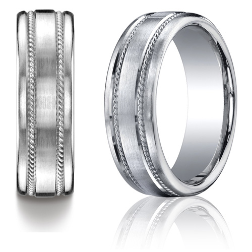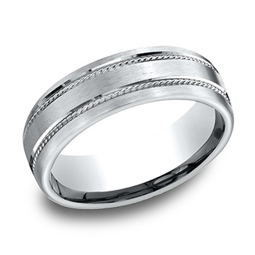 Platinum wedding band features rope detailing and satin finish. Die struck and comfort fit. Width: 7.5mm. Solid platinum 950 [95% Platinum, 5% Ruthenium alloy]. Made in the USA.