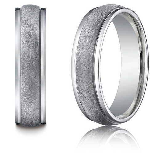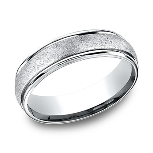 Platinum wedding band features polished step down edges and a swirled finish center. Die struck and comfort fit. Width: 6mm. Solid platinum 950 [95% Platinum, 5% Ruthenium alloy]. Made in the USA.