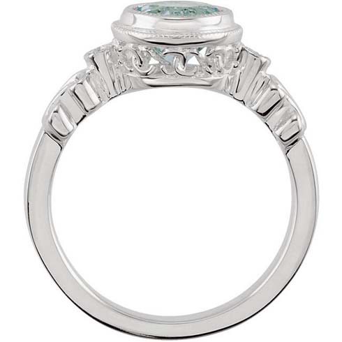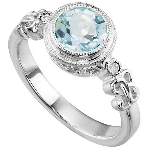 Polished sterling silver ring features a 1.1 ct genuine round aquamarine and two diamond accents. Weight: 3.48 grams. Diamond details: 2 x .010 ct, color H, clarity I2. Aquamarine details: 7mm round, good cut, C2 grade color, clarity eye clean.