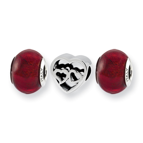 The Love's Reflection bead set fits all major modular bracelet brands. The set consists of three beads: two red Italian Murano QRS2760, and hearts QRS2452. Made of antiqued, solid sterling silver. Imported.