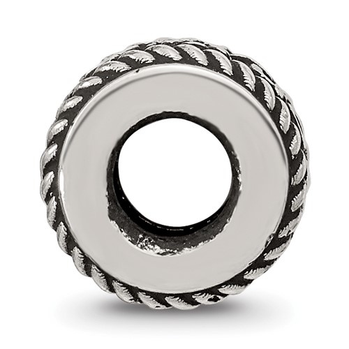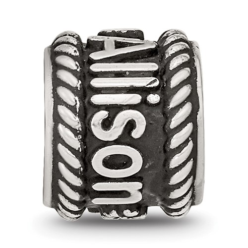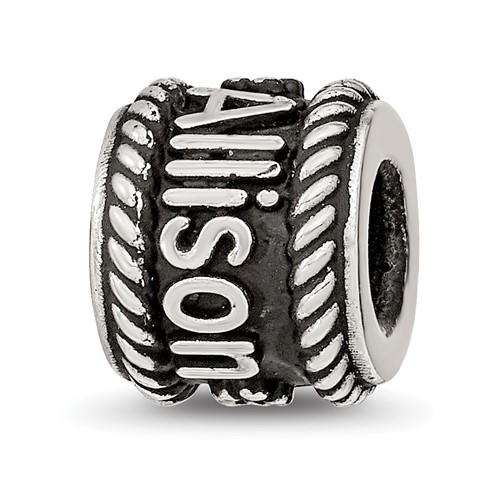 Engrave up to 16 letters and spaces on this Reflections personalized name bead. Bead features rope borders and flower design on the reverse. This bead is composed of antiqued, solid sterling silver. For names up to eight letters the name will appear on the bead twice. Made in USA.