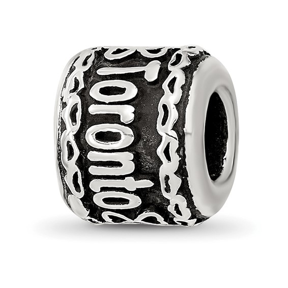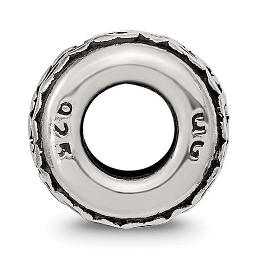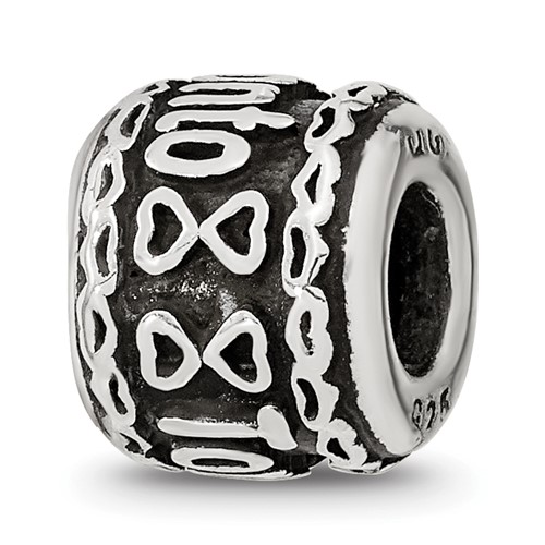 This bead features heart borders and your chosen message. Engrave up to 16 letters and spaces on this Reflections personalized name bead. For names up to eight letters the name will appear on the bead twice. This bead is composed of antiqued, solid sterling silver. Made in USA.
