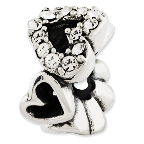 This hearts bead features white Swarovski elements. The bead is made of antiqued solid sterling silver. This bead fits all major modular bracelet brands. Imported.