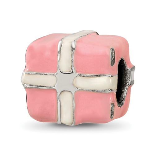 Enameled pink and white present bead is made of solid sterling silver. This bead fits all major modular bracelet brands. Imported.