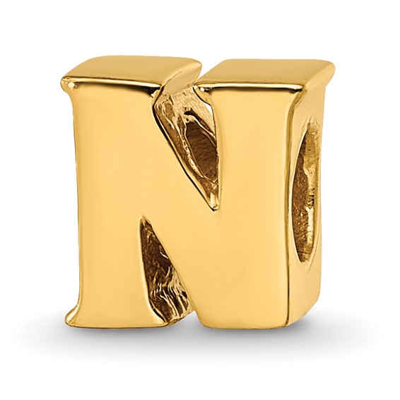 Letter N bead is made of solid sterling silver with yellow gold plating. Plating is two microns. This bead fits all major modular bracelet brands. Imported.