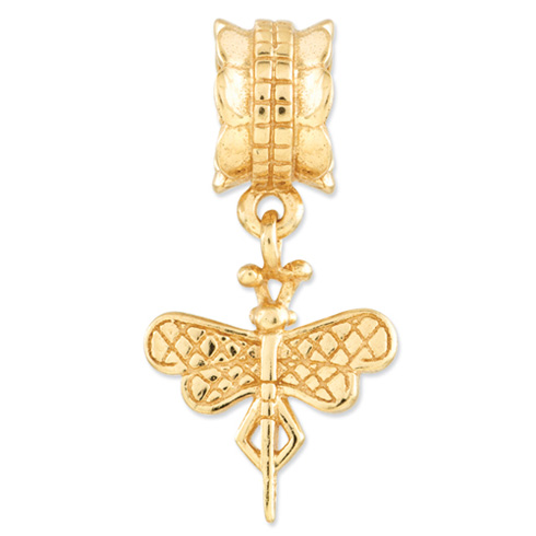 Dragonfly dangle bead is made of gold-plated solid sterling silver. This bead fits all major modular bracelet brands. Imported.